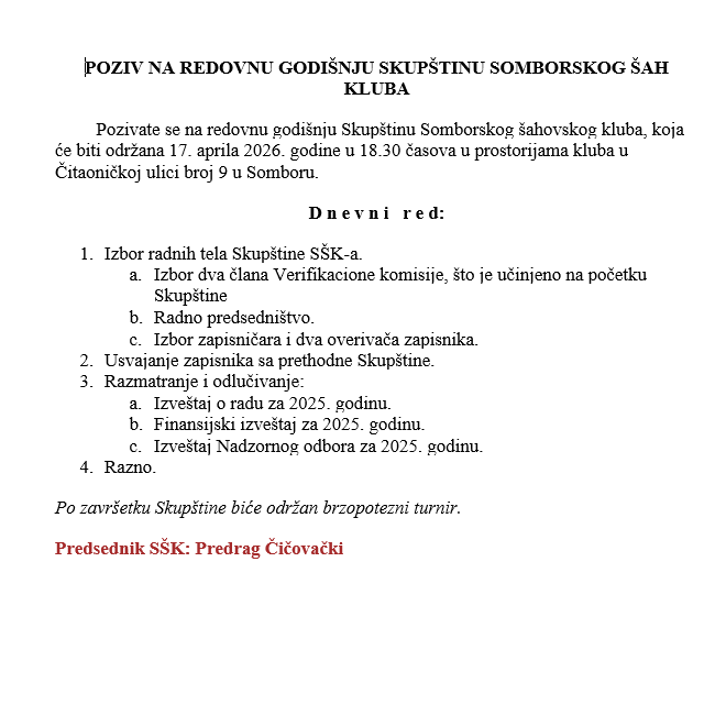 Pozivate se na redovnu godišnju Skupštinu Somborskog šahovskog kluba, koja će biti održana 12. decembra 2025. godine u 18.30 časova u prostorijama kluba u Čitaoničkoj ulici broj 9 u Somboru.
